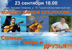 Барды Юга России выступят в Брянске 23 сентября в Городском выставочном зале на бульваре Гагарина состоится концерт бардов Юга России «Солнце, море и друзья!». Своим творчеством с брянцами поделятся Дмитрий Крымский из Туапсе, Сергей Котлов из Краснодара и Сергей Верещагин из Майкопа. Они – лауреаты и дипломанты различных краевых и всероссийских фестивалей авторской, бардовской песни. Также они сами являются организаторами различных фестивалей. В Брянске барды исполнят авторские романсы, философские зарисовки, искрометные и юмористические песни. Кроме того, у зрителей будет возможность познакомиться с областной отчетной выставкой Брянской организации «Союз художников России» «Родная Брянщина», рассказали корреспонденту газеты БРЯНСК.RU в департаменте культуры Брянской области. БРЯНСК.RU