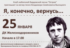 | Версия для печати 25 января в 17:00 в ДК Железнодорожников в Фокинском районе города Брянска состоится вечер, посвященный жизни и творчеству известного поэта, автора-исполнителя, актера театра и кино, яркого, незаурядного человека Владимира Семеновича Высоцкого. Именно в этот день он родился, и по всей стране давно стало доброй традицией проводить такие вечера его памяти. В программе мероприятия – исполнение членами клуба любителей бардовской песни «Остров», солистом областной филармонии Павлом Тонких, музыкантами Татьяной Ивченко и Валерием Деревянко, Татьяной Шиловой и Еленой Смирновой стихов и песен Владимира Высоцкого. Стоимость билета составит 300 рублей. Дополнительную информацию о концерте можно узнать по телефону 8-952-966-10-77.