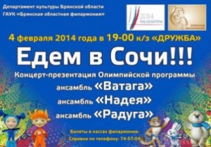 В Брянске пройдёт концерт «Едем в Сочи!» 4 февраля, за три дня до открытия Олимпиады, в концертном зале «Дружба» пройдет презентация Олимпийской программы творческих коллективов, которые представят Брянщину в Русском доме в Сочи. Перед зрителями выступят ансамбли «Ватага», «Надея», а также коллектив «Радуга», который вошёл в число участников Сводного хора России. Концерт «Едем в Сочи!» начнётся в 19:00. БРЯНСК.RU