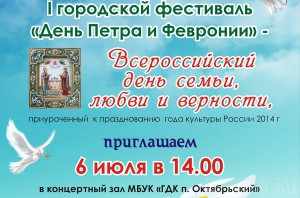 В это воскресенье пройдет I городской фестиваль «День Петра и Февронии» В концертном зале «ГДК п. Октябрьский» 6 июля в 14.00 состоится I городской фестиваль «День Петра и Февронии», приуроченный к Всероссийскому дню семьи, любви и верности. Для пришедших на праздничное мероприятие выступят ведущие творческие коллективы города Брянска, прозвучат народные песни, покажут танцы и обряды. Также состоится чествование супружеских пар, будут угощения и подарки, сообщили газете БРЯНСК.RU в Брянской городской администрации. БРЯНСК.RU