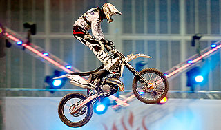 | Версия для печати В середине ноября прошел один из крупнейших праздников в мотожизни столицы. FMX Masters Adrenaline Rush - мотофристайл-шоу, в котором в этом году приняли участие сильнейшие спортсмены из разных стран мира. Россию на FMX Masters представлял Алексей Колесников.15 и 16 ноября на арене спорткомплекса Олимпийский 12 райдеров показали все свое мастерство в прыжках на мотоциклах. А мастерство, надо сказать, у ребят на высшем уровне. Сложные прыжки с мотоциклом под/над/справа/слева от райдера выполнялись не только технично, но и крайне эффектно. Московская публика была в восторге. Как выяснилось, ребята не только прекрасные райдеры, но и отличные шоу-мены. В перерывах между выступлениями (выступали спортсмены парами) некоторые из участников выходили к трибунам, общаясь с прессой и зрителями. Особенно это понравилось итальянцам Массимо Бианочини и Альваро Даль Фарра, которые по окончании мероприятия пригласили "всех симпатичных девушек" на продолжение "банкета" в клуб к "Ночным волкам". После каждого выступления, состоящего из 4-х прыжков, спортсмены проезжали на мотоциклах перед трибунами, исполняя вилли, стоппи или просто "жгли резину". Чем дальше, тем больше. Ближе к середине мероприятия очередная пара райдеров, итальянец Ванни Одерра и Алексей Колесников, бросили байки, перемахнули через ограждения и полезли на трибуны к благодарным зрителям. Довольные болельщики тут же оккупировали спортсменов, так что дальше средних рядов ребятам пройти не удалось. Спустя короткое время после начала шоу стартовало второе негласное соревнование: что придумает каждая пара участников, чтобы привлечь зрителя. Помимо упомянутых трюков и выхода к народу один из райдеров запустил в толпу болельщиков своей футболкой, чему последние крайне радовались (по крайней мере в попытке поймать трофей были замечены не менее шести пар рук). Еще один из участников состязаний упоенно громил своим байком картонные коробки, которые играли роль ограждений импровизированной трассы. Для сооружения которой, кстати, понадобилось 1500 кубических метров глинозема, 50 грузовиков и почти 300 человек. А другой продолжал исполнять трюки в воздухе даже после того, как положенные 4 прыжка были совершены. Прервемся на описание процесса. Каждый день состоял из трех "порций" прыжков. С каждой из них сложность исполняемых трюков увеличивалась. Все участники были поделены на две команды, названные в честь двух российских столиц: Москва и Санкт-Петербург. Помимо командного первенства, райдеры участвовали и в личном зачете. Однако, как мне показалось, каждый спортсмен соревновался в первую очередь с самим собой, стараясь в каждом трюке превзойти свои прошлые достижения. На FMX Masters 2008 в полной мере оправдал себя олимпийский принцип: главное - не победа, а участие. В финале все 12 райдеров одновременно исполняли сложнейшие трюки с минимальным расстоянием между собой, что выглядело эффектно со стороны, но было довольно опасно на деле. Шесть спортсменов один за другим взлетали в воздух, крутя мотоцикл во всевозможных направлениях. Особой популярностью пользовался backflip - сальто назад - в различных его вариациях. После окончания фееричного шоу, которым завершились два дня соревнований, спортсмены окончательно побросали свои байки и вышли к зрителям. Организаторы шоу заготовили несколько десятк
