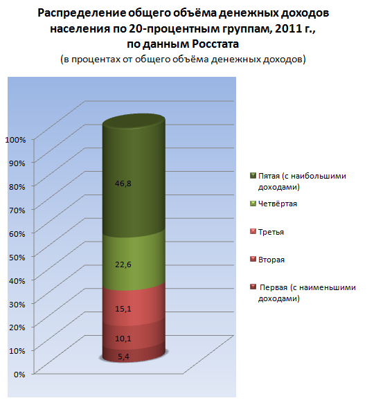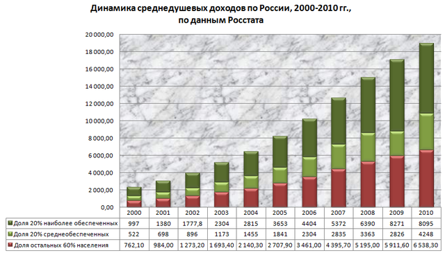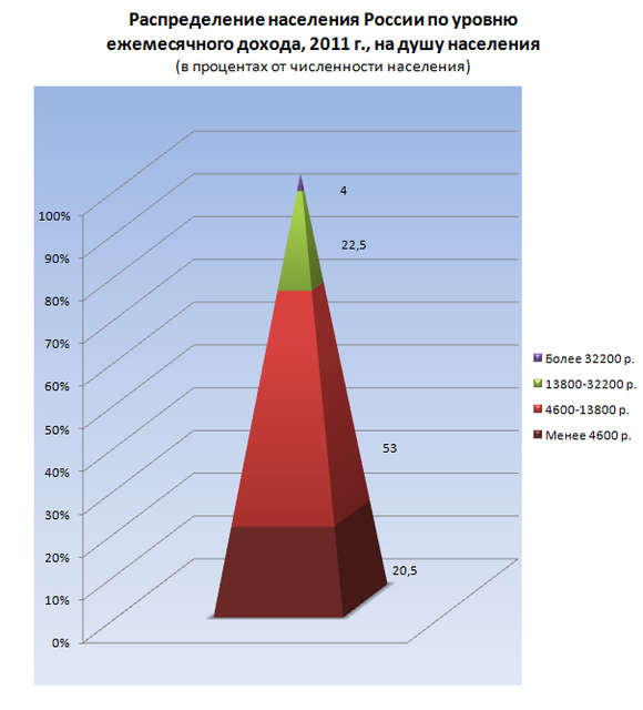 | Версия для печати Сегодня мы нанесём мощный удар цифрами и графиками по важнейшим, но ещё не добитым до конца пропагандистским мифам - о невероятном росте благосостояния населения, решённой демографической проблеме, подъёме транспортного сектора, восстановлении промышленности и сельского хозяйства. Мы докажем, что всё это - ложь. Предыдущие две части Пособия имели серьёзный успех среди трудящихся и разумных людей, настоящих патриотов России - ибо многолетние бурные потоки слащавой дезинформации с телеэкрана и их пенные брызги в Сети попросту достали каждого, кто способен отличать чёрное от белого. Это вызвало закономерную истерику у забившихся в припадке пропагандистов и проплаченных блогеров, принявшихся строчить крайне бездарные "разоблачительные" посты, в лишний раз доказывая, что мы, дорогие друзья, - на верном пути. Пусть же и дальше беснуются предатели Родины в запоздалой и тщетной попытке выставить себя пламенными патриотами - а мы, тем временем, будем двигаться вперёд и сами диктовать повестку дня. Время провокаторов и пропагандистов, паразитирующих за наш счёт - счёт налогоплательщиков России - ушло безвозвратно, и теперь командовать парадом будем мы. Поэтому не будем отвлекаться и перейдём сразу к делу. «ЖИТЬ СТАЛО ЛУЧШЕ, ЖИТЬ СТАЛО ВЕСЕЛЕЙ» Вот он – самый главный миф пропагандистов: высокое благосостояние населения и рост рождаемости вместе со снижением смертности. Разберёмся. Пропагандисты нам постоянно тыкают в лицо ростом среднедушевых доходов населения. ![]() Они любят высчитывать среднюю температуру по больнице, добавляя к статистике ребят из рейтинга «Форбс». Но мы-то помним, что разница в доходах 10% наиболее и 10% наименее обеспеченного населения по итогам 2010 г. составила 16,5 раз. 3/4 населения России – малообеспеченные или наиболее нуждающиеся граждане. Именно к такому выводу пришли в статье «Неравенство в распределении доходов и уровне бедности населения: межстрановые сопоставления» в журнале Росстата «Вопросы статистики» (№6 за 2011 г.) специалисты социологических центров России, Азербайджана, Казахстана, Украины и Белоруссии, которые провели сопоставительный анализ республик по уровню доходов. ![]() Иными словами, доходы почти 3/4 населения России составляют меньше $ 500 в месяц. Только 5,7 млн. чел. в нашей стране действительно могут быть довольны жизнью. А остальным 137,3 млн. пропаганда пытается навязать ложное представление о невероятно высоком росте уровня благосостояния. Данные непосредственно с сайта Росстата подтверждают эту картину: ![]() Росстат, правда, более оптимистичен, и полагает, что лишь 54% населения имеют доход менее $ 500 в месяц. Теперь посмотрим, как между ними распределяется денежная масса доходов. ![]() Итак, 20% населения РФ загребают почти такой же объём доходов, как и остальные 80% граждан вместе взятые. Естественно, в эти 20% входят и 200 ребят из списка русской версии журнала «Форбс». Понимание этого позволяет нам не считать среднюю температуру по больнице, и определить среднедушевой доход с разбивкой на доли в нём населения разной степени обеспеченности. Получаем: ![]() Чтобы проверить эти результаты, нужно умножить среднедушевой доход за каждый год на общую численность населения в соответствующем году, а затем отнимать от получившейся общей суммы денежных доходов каждый раз по той доле, что п