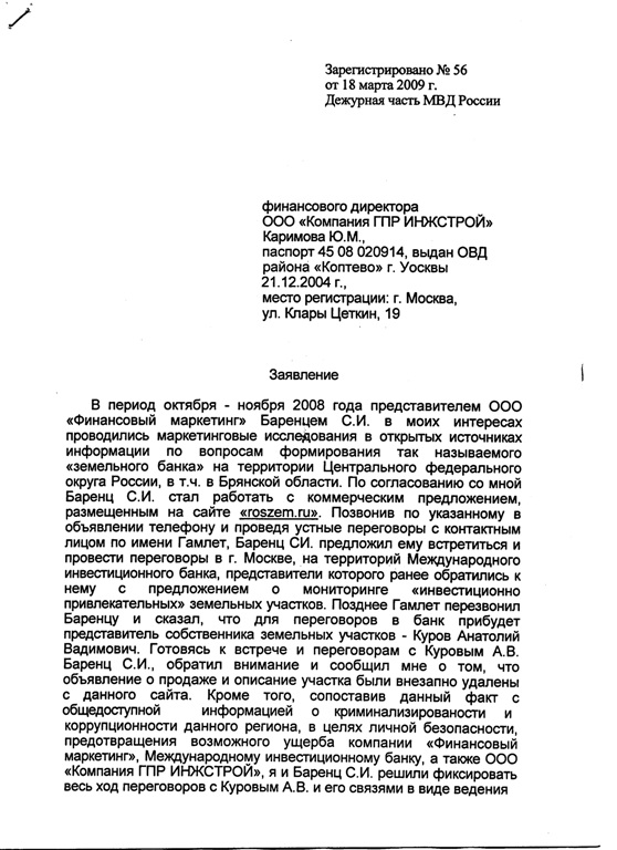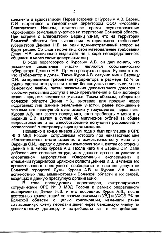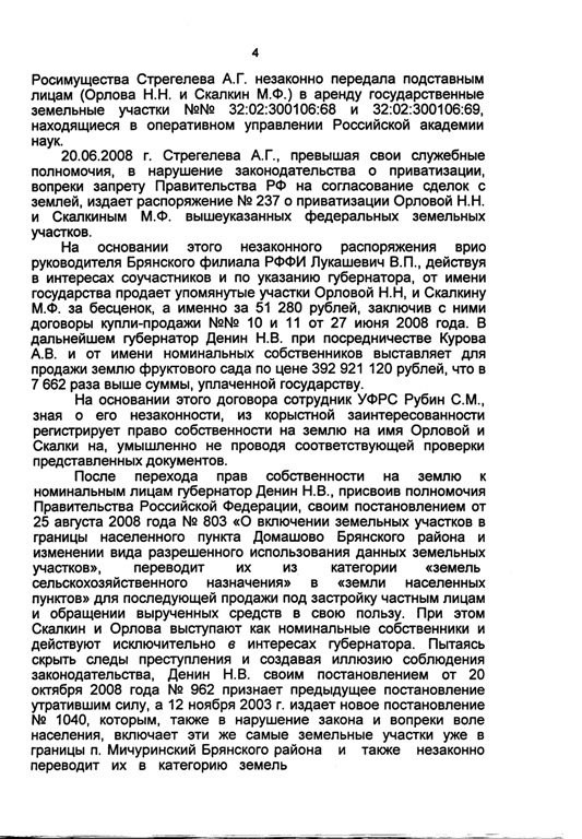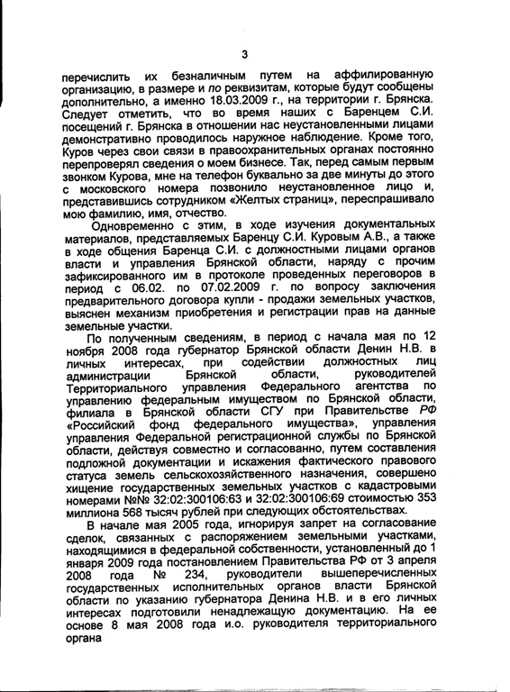 | Версия для печати ![]() Директор ООО "Финансовый маркетинг" Сева Баренц и губернатор Брянской области Николай Денин после подписания соглашения Подозреваемыми по делу проходили заместитель губернатора Брянской области Симоненко Н.К., конкурсный управляющий ГУП «ОПХ «Брянское» Платонов, исполнительный директор ОПХ Горлович и руководитель ОАО «Снежка» Мельников. Любопытный текст заявления проливает свет на подробности нашумевшего скандала в Брянске, когда под угрозой уголовного преследования мог оказаться губернатор Николай Денин. Обо всем по порядку… Лапшу на уши вешать - не мешки таскать 19 марта 2009 года в администрации Брянской области губернатор Николай Денин принимал генерального директора ООО «Финансовый маркетинг» Севу Баренца и подписал с ним соглашение о строительстве коттеджного поселка вблизи Мичуринского. На подписании также присутствовали генеральный директор ООО «Управляющая компания «Новые технологии» Анатолий Куров, заместитель Губернатора Петр Белозор, начальник управления имущественных отношений Брянской области Дмитрий Полещенко, сообщила тогда пресс-служба администрации. В привычной для себя манере губернатор сулил сплошные блага от данного соглашения, лепеча, что за счет бюджетных средств задачу развития территорий не решить. Убеждал общественность, что появление такого инвестора, как ООО «Финансовый маркетинг» — это заметный вклад в развитие малоэтажного строительства на Брянщине. Не смог кормилец всея Брянской области Денин не выразить и собственной радости от «социальной ориентированности проекта». Начали за здравие Уже через месяц, в апреле 2009 года в Брянске высадился десант из сорока двух сотрудников правоохранительных органов из Москвы. Следственный комитет при прокуратуре РФ с привлечением сотрудников ДЭБ МВД России начали проводить проверку в администрации Брянской области по факту «незаконных действий ряда должностных лиц Брянской области при продаже земель, находящихся в федеральной собственности». Уже через день губернатор Николай Денин на лихом коне поскакал в Москву на прием к первому заместителю руководителя Администрации президента Владиславу Суркову. Пресс-служба Денина сообщила журналистам, что цель неожиданного визита – это «вопросы экономической ситуации в регионе». В реальности Денин поехал к Суркову «решать вопрос» неожиданного наезда правоохранителей. 16 июня 2009 года по результатам проверки было возбуждено уголовное дело, а через пять месяцев - 19 ноября, был арестован подозреваемый в причастности к преступлению заместитель губернатора Брянской области Симоненко Н.К, в доме которого и рабочем кабинете были проведены обыски. Симоненко были предъявлены обвинения по ч. 4 ст. 159 УК РФ «Мошенничество в особо крупном размере», ч. 3 ст. 165 УК РФ «Причинение имущественного ущерба путем обмана» и по ст. 33 и ч. 1 ст. 195 УК РФ «Пособничество при неправомерных действиях при банкротстве». Обвинения так же были предъявлены конкурсному управляющему ГУП «ОПХ «Брянское» Алексею Платонову, исполнительному директору хозяйства Александру Горловичу и руководителю ОАО «Снежка» Алексею Мельникову. Сразу после этого Денин в ужасе срочно вылетел на отдых в Карловы Вары, от греха подальше. Опасения были не напрасными т.к. если бы Симоненко начал сотрудничать со следствием, то 