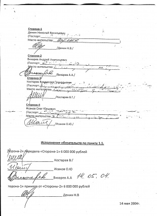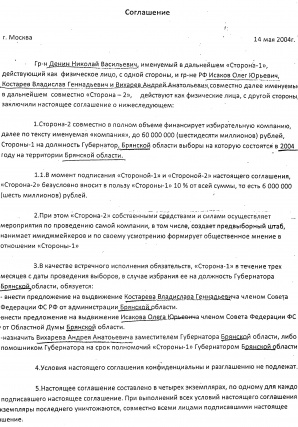 | Версия для печати Николай Денин взял у авторитетов уральской ОПГ 60 млн рублей на свои выборы в губернаторы Брянской области. Взамен обещал им «крутые» должности. Агентство «Росбалт» в статье «В Совет Федерации за 60 млн рублей» опубликовало оригинальный текст письменного соглашения, которое заключили 14 мая 2004 года Николай Денин и так называемые бизнесмены из Свердловской области Владислав Костарев, Олег Исаков и Андрей Вихарев. Оно попало в руки Следственного Комитета России при одном из обысков по уголовному делу заместителя губернатора Брянской области Николая Симоненко. Согласно документу, так называемые «коммерсанты» обязались выделить Николаю Денину 60 млн рублей на предвыборную кампанию с немедленной передачей 10 процентов от этой суммы, а потенциальный глава региона, в случае победы, - выдвинуть Владислава Костарева и Олега Исайкина в члены Совета Федерации, а Андрея Вихарева назначить либо своим заместителем, либо помощником главы региона. «Условия настоящего соглашения конфиденциальны и разглашению не подлежат», — говорится в соглашении.