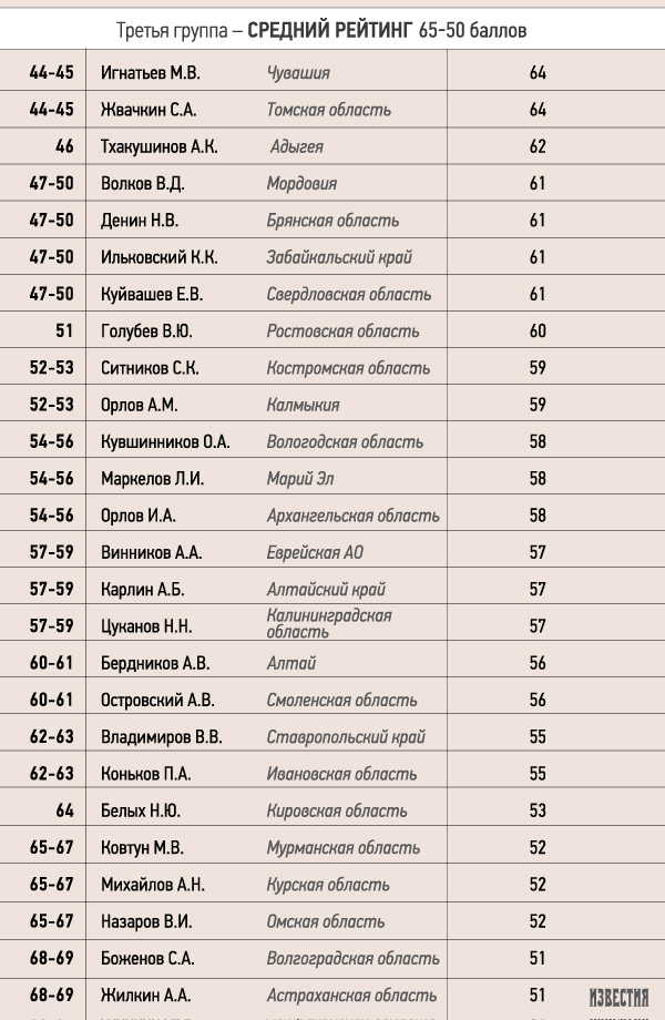 Глав регионов распределили по четырем группам: «Лидеры» (очень высокий рейтинг), «Между небом и землей» (высокий рейтинг), «На грани фола» (средний рейтинг) и «Группа смерти» (рейтинг ниже среднего).