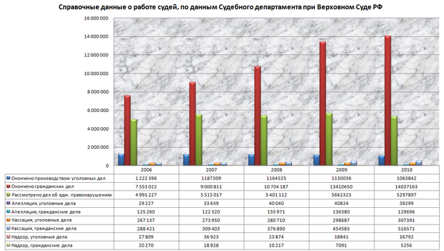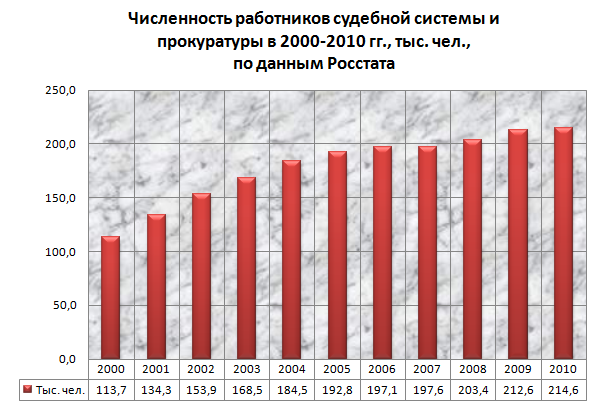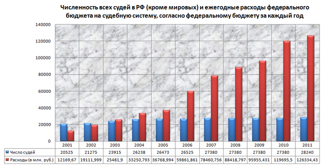 | Версия для печати Пожалуй, нет такой страны в мире, судебная система которой была бы ещё хуже, чем в России. Поясню это оценочное суждение. Во многих странах мира судьи исправно штампуют заведомо неправосудные приговоры. Они и существуют только для этого. Например, в государствах Африки или Латинской Америки. Так чем же у них судебная система лучше нашей? Хотя бы тем, что там она даже не претендует на какой-то авторитет. В Демократической Республике Конго все знают, что такое суд – и не ждут от него ничего хорошего. И судьи знают, что народ о них думает, и потому также не пытаются делать вид, будто они занимаются чем-то полезным для общества, например - справедливым судопроизводством. Они исполняют указания властей всегда, просто по умолчанию. А если указания не поступило – например, в гражданском процессе – они просто берут деньги и решают дела в пользу тех, кто дал больше. В Конго это нормально, там никто даже и не подозревает, что бывает как-то иначе. Ибо там никогда и не было справедливого правосудия. А вот когда в России абсолютно прогнившая, ничем не отличающаяся от африканской система «правосудия» претендует на некий авторитет в обществе, когда народ слышит патетические реляции о справедливости судебных решений и независимости судей - это, знаете ли, наглость. Поскольку, во-первых, практически все, включая самих судей, прекрасно осведомлены о том, какие чувства испытывает общество к судебной системе. Во-вторых, хотя судьям и наплевать на наше мнение о них – они, тем не менее, требуют от нас обращения к ним в судебном заседании не иначе, чем «Ваша честь». А ведь у многих не повернётся язык произнести такую фразу. Потому что Россия – это не Африка. Хотя нас и усиленно подводят к этому уровню. Тем не менее, мы-то знаем, что в мире бывают и нормальные судебные системы, и честные судьи – в частности, в государствах Западной Европы и в США. Более того, Россия – это, вообще-то, великая держава, постоянный член Совета безопасности ООН и «восьмерки», страна с тысячелетней историей. А это значит, что наличие у нас такой же прогнившей судебной системы, как и в самых отсталых и упадочных государствах мира, но требующей уважения к себе, словно к европейской, причём от людей, которые, в отличие от несчастных африканцев, реально знают, как обстоят дела с судопроизводством в ЕС - говорит лишь о том, что именно наша судебная система намного хуже, чем в Африке. Она открыто противоречит самому статусу России на мировой арене и является чужеродным, позорным инструментом в руках мелкого политического режима, который, в принципе, гармоничнее смотрелся бы где-то между Зимбабве и Ботсваной. Более того, в Африке судьи зачастую фактически находятся на «самофинансировании» – а у нас на них тратятся миллиарды долларов в год. Достойны ли они того, чтобы мы – граждане России - из собственного кармана, как налогоплательщики, так высоко оплачивали их работу, в корне не устраивающую нас? Ведь посмотрите для начала численность работников судебной системы (и заодно прокуратуры – раз уж даже Росстат решил, что они неотделимы друг от друга): ![]() За 10 лет мы получили чуть ли не двукратное увеличение штатов судебной системы и прокуратуры. ![]() Для справки: число мировых судей в 2011 г. составляло 7853 чел. Они в график выше не входят. Как видно, расходы на судебную систему росли намн