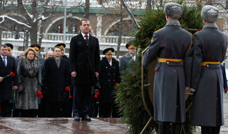 | Версия для печати Президент России Дмитрий Медведев в День защитника Отечества возложил венок к Могиле Неизвестного солдата в Москве. Также глава государства вручил грамоты о присвоении почетного звания "Город воинской славы" четырем новым городам.Медведев прибыл в Александровский сад перед торжественной церемонией вручения грамот о присвоении звания "Город воинской славы". В церемонии возложения венка также приняли участие премьер-министр Владимир Путин, министр обороны Анатолий Сердюков, руководство верхней и нижней палат парламента, ветераны Великой Отечественной войны, передает ИТАР-ТАСС. В праздник, 23 февраля в России пополнится список городов-героев. Глава государства вручил грамоты о присвоении почетного звания "Город воинской славы" представителям Коврова (Владимирская область), Ломоносова (пригород Санкт-Петербурга), Таганрога (Ростовская область) и Петропавловска-Камчатского (Камчатский край). Как говорится в тексте документов, Ломоносову это звание присвоено в награду за действия во время блокады Ленинграда, Таганрогу – за действия по обороне Ростова-на-Дону. Петропавловску – за вклад в победу над Японией, а Коврову за работу оборонных предприятий и подготовку подполья к возможной оккупации, сообщает РБК. Соответствующие указы о присвоении этим городам почетного звания "За мужество, стойкость и массовый героизм, проявленные защитниками городов в борьбе за свободу и независимость Отечества", президент подписал еще 3 ноября 2011 года. Сегодня в России насчитывается 37 городов воинской славы. Источник: