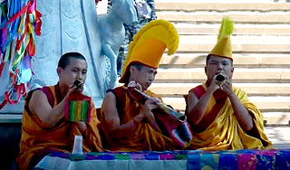 | Версия для печати Этим летом впервые за последние 100 лет в России был проведен древнейший буддийский ритуал - Мистерия Цам. 32 монаха из индийского монастыря Дзонкар Чодэ приехали в столицу республики Калмыкия, Элисту, чтобы провести эту церемонию. Уникальную видеозапись события показал интернет-телеканал Russia.Ru.Мистерия Цам – это молитва в танце, призванная устранить негативные моменты, препятствия и страдания человека. Тибетские мастера ритуального танца изображают буддийских божеств, защитников всего живого на Земле. Эта церемония является мостом между невидимым миром просветленных божеств и миром людей. Поэтому сложная многочасовая мистерия требует серьезной подготовки. Ламы, исполняющие роли ведущих персонажей, проходят длительное затворничество, созерцая то божество, которое затем будут представлять в танце. Обращаясь к нему с молитвами, начитывая его мантры, представляя себя в его образе, они стремятся впитать его энергию и духовную силу, чтобы затем, облачившись в старинную маску и костюм из золотой парчи, стать божеством, явив его благословение людям. Тэло Тулку Ринпоче, верховный лама Калмыкии рассказывает: "Церемония Цам на протяжении многих столетий существовала на территории Калмыкии, к сожалению, в определенный момент в истории эта традиция была прервана. Сегодня мы приглашаем Цам для того, чтобы постараться возобновить эту традицию. Церемония Цам относится к тантрическому буддизму". Мистерия проходила в Золотой Обители Будды Шакьямуни. Это самый большой буддийский храм в Европе, его строительство благословил Далай-Лама XIV, он же выбрал и название для храма. Чтобы присутствовать и участвовать в уникальной церемонии, на площади перед храмом собрались тысячи людей. Это не только жители Калмыкии, но и паломники со всей России и других стран. Впрочем, считается, что действие ритуала распространяется не только на тех, кто находится рядом с монахами. Напротив, Мистерия Цам устраняет препятствия и помогает преодолевать кризисы всем жителям России и всего мира, людям всех конфессий и верований. Устрашающие маски с черепами, в которых танцуют монахи – это обличие дхармапалов, богов-защитников. В буддизме считается, что чем страшнее божество, тем добрее оно к людям и тем выше его сострадательность. Покровители кладбищ изображаются в виде человеческих скелетов. Их танец должен напомнить людям о бренности бытия, о том, что смерть неизбежна, а время ее наступления не определено. Весь ритуал сопровождается специфическими трубными звуками, извлекаемыми монахами из духовых инструментов. Это подношение музыкой буддийским богам. "Этот ритуал позволяет соприкоснуться с божествами таинственного буддийского мира. И Мистерия Цам является тем ритуалом, который позволяет находится в пограничном состоянии между живимы существами и божествами. И когда приходит этот ритуал, когда сидишь, медитируешь, молишься, то весь негатив уходит, препятствия уходят и открывается дорога, позволяющая человеку соприкоснуться с добрыми, с прекрасными буддийскими божествами", - говорит глава Калмыкии Кирсан Илюмжинов. Источник:
