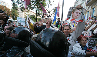 | Версия для печати В центре Киева начались столкновения между сторонниками Юлии Тимошенко и милицией. Митингующие прорываются за оцепление, несмотря на судебный запрет шествий в День независимости. Акции проходят и возле Лукьяновского СИЗО, где держат экс-премьера.Милиция преградила протестующим путь на Крещатик. Однако в нескольких местах сторонникам Тимошенко удалось прорвать первую шеренгу милиционеров. В настоящее время проход к Крещатику перекрыт автозаками. В разных районах города возникают стычки между оппозицией и милиционерами. Толпа скандирует "Ганьба!" ("Позор!"). Несколько раз в ход были пущены камни и бутылки, сообщает РИА Новости. Митингующие вступили в драку с сотрудниками спецподразделения "Беркут", составляющими оцепление. После этого к спецназовцам подошло несколько депутатов парламента Украины, которые убеждают сотрудников милиции "не устраивать провокации" и пропустить митингующих в центр Киева. Как сообщают представители объединения "Батькивщина", на улице Владимирская против оппозиционеров применили слезоточивый газ. Протестующие принимали участие в шествии от парка Шевченко, где утром состоялся митинг, приуроченный ко Дню независимости Украины. По данным милиции, в митинге участвовало около трех тысяч человек, сообщает "Корреспондент.net". По последним сообщениям очевидцев, милиция начала подтягивать к парку автозаки для перевозки задержанных, сообщают очевидцы. Ранее в честь Дня независимости сторонники Юлии Тимошенко провели специальную акцию возле Лукьяновского СИЗО, где содержится экс-премьер. Как сообщает "Интерфакс", несколько сотен участников АвтоМайдана прибыли к зданию на автомобилях и байках. Участники повязали желто-голубые ленточки на здание СИЗО. Там же прошел митинг оппозиционеров. Между тем сама Юлия Тимошенко написала из СИЗО заявление под названием "20 тезисов на 20 лет". В нем экс-премьер изложила свои мысли и впечатления последних дней, а также процитировала Сартра и вновь отметила, что "скучает по "Твиттеру". "Никаким крысиным ядом меня не травят, это какие-то легенды... Крысы здесь ходят довольно свободно. Зная украинскую политику, могу сказать: далеко не худшие животные!" – прокомментировала Тимошенко недавние сообщения СМИ. Говоря о своем заключении в "Лукьяновке", Тимошенко заявила: "На 25-летний юбилей эта тенденция будет изменена! В тюрьме будут сидеть не политические, а настоящие преступники. Сегодня мы их знаем поименно". По словам политика, на десятилетие независимости она думала, что на 20 лет "все будет хорошо". "Украина утвердится как независимое государство, будет в европейской семье. Но сегодня Украина в еще большей опасности... Она уже взрослая... Но сейчас, как никогда, нуждается в нашей защите", – приводятся слова экс-премьера на ее официальном сайте. Источник: