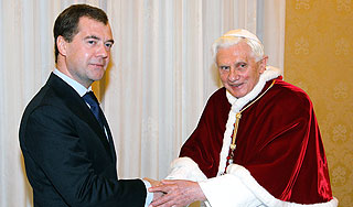 | Версия для печати Президент России Дмитрий Медведев в четверг встретился с Папой Римским Бенедиктом XVI. Он подарил понтифику несколько книг и провел краткую встречу с государственным секретарем Ватикана кардиналом Тарчизио Бертоне.Нынешний визит главы российского государства в Ватикан стал первым после установления полноформатных дипломатических отношений между Россией и Святым Престолом. В декабре 2009 года Медведев уже посещал Ватикан с рабочим визитом, после которого повысил статус российского представительства там до посольства. В этот раз Бенедикт XVI встретил президента России в Малом тронном зале, и пригласил его в библиотеку, находящуюся в частных покоях Папы. Глава Римско-католической церкви отметил важность посещения Ватикана президентом, и они проговорили около получаса. После беседы состоялся обмен подарками между Дмитрием Медведевым и Бенедиктом XVI. Глава российского государства вручил Папе последний вышедший в свет том Православной энциклопедии и изданную к 80-летию со дня рождения Бориса Ельцина его переписку с главами зарубежных государств и правительств, в том числе и со Святым Престолом. Также президент подарил понтифику выполненную на эмали панораму Московского Кремля. "Вы здесь живете?" – заинтересованно спросил Бенедикт XVI, восхитившись красотой архитектуры Кремля. "Нет, я здесь работаю", - пояснил Дмитрий Медведев. В свою очередь Папа Римский вручил президенту высеченное из камня панно с изображением собора Святого Петра, передает РИА Новости. По окончании аудиенции у папы Римского Медведев провел краткую встречу с государственным секретарем Ватикана, кардиналом Тарчизио Бертоне. Источник: