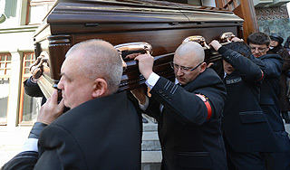 | Версия для печати В Москве поклонники, друзья и коллеги аплодисментами и криками "Браво" проводили в последний путь актера Андрея Панина, тело которого было обнаружено в его квартире в Москве. Артиста похоронили на Аллее актеров на Троекуровском кладбище рядом с Владиславом Галкиным.Гражданская панихида проходила в МХТ имени Чехова. Гроб с телом актера стоял на основной сцене театра, рядом сидели друзья и семья Панина. На экране над гробом демонстрировали фотографии актера и кадры из фильмов с его участием. Попрощаться с любимым артистом пришли более 200 человек, люди нескончаемым потоком несли цветы и венки. Среди пришедших на траурную церемонию – замминистра культуры Иван Демидов, художественный руководитель МХТ им. Чехова Олег Табаков, гендиректор Первого канала Константин Эрнст, Никита Высоцкий, режиссер, учитель Панина Александр Калягин, друзья и коллеги артиста – актеры Гоша Куценко, Станислав Дужников, Алексей Панин, Иван Кокорин, Валерий Гаркалин, режиссеры Карен Шахназаров, Андрей Прошкин и Александр Стриженов, актрисы Ирина Апексимова, Кристина Бабушкина, Юлия Меньшова, Анна Банщикова, художник Павел Каплевич. Церемонию прощания вел актер Игорь Золотовицкий. "Сказать, что мы прощаемся с Андреем, как-то глупо. Он из нас сильно выделялся. Невозможно говорить. – начал Золотовицкий и зачитал телеграммы от премьер-министра России Дмитрия Медведева, мэра Москвы Сергея Собянина, а также соболезнование от одноклассников Панина, которые вместе с ним учились в кемеровской школе. – Я бы сказал, что все-таки он был театральный актер. Простят меня наши друзья-кинематографисты, но он был велик в театре. Кто это видел, непонятно, как он играл. Как Андрей делал такое? Когда он играл, было слышно и понятно все про человека". Потрясающую манеру игры Панина вспомнил и его коллега Валерий Гаркалин. "В наше сознание не умещается эта правда о том, что Андрей мертв. В моем сознании он продолжает жить. И это сознание несется в прошлое в это же здание, в буфет, куда я зашел перекусить, а за столом увидел Рому Козака – тогда он был очередным режиссером МХТ. И с ним рядом сидел незнакомый мне человек. Рома позвал меня и сказал: "Хочу познакомить тебя с артистом художественного театра, который также плохо, как и ты, разговаривает со сцены". Андрей начал возмущаться, а я сказал: "Не волнуйся. Это признак хорошего артиста", – рассказал Гаркалин. Он вспомнил, как играл вместе с Паниным в постановке по пьесе Евгения Гришковца "Зима". "Я не знал, что потом судьба осчастливит меня тем, что Андрей ворвется в проект по пьесе Гришковца. Его пьеса "Зима". Так случилось, что в нее вошел Женя Дворжецкий, но не смог играть, так как трагически погиб. Андрей сразу ворвался в эту роль яростно. Он играл каким-то не существующими в природе рычагами. Помню, он читал монолог, а я лежал в песочнице вверх ногами (Паша Каплевич придумал потрясающую сценографию) и после каждого его предложения я кричал ему в спину: "Оскар!" Так я раздавал ему "Оскары". Потом Андрей прекратил репетировать и сказал, что не может, так как Гаркалин ему "Оскары" раздает. Каждый, через чью жизнь прошла жизнь Андрея, может считать себя счастливым человеком", – отметил Гаркалин. Один из школьных друзей Андрея Панина – Александр – рассказал, что "в Сибири Панина считали не просто кумиром, а почти родственником". "