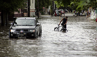 | Версия для печати Владивосток пострадал от мощного тайфуна. В городе затоплены улицы, возникли перебои с движением транспорта. Спасатели рекомендуют гражданам не покидать свои дома без необходимости. Между тем в ближайшее время улучшения погоды не предвидится.Штормовой ветер, сила которого достигала 20 метров в секунду, повалил десятки деревьев и оборвал линии электропередачи. Несколько микрорайонов города остались без света, сообщают "Вести.Ru". За минувшие сутки выпало уже до 50 миллиметров осадков, то есть треть месячной нормы для Владивостока. В течение нескольких часов вода затопила трассы и улицы города, расположенные в низинах. Возникли перебои с движением трамваев. Автомобили на затопленных улицах глохнут один за другим, уровень воды доходит до высоты дверных ручек машин. Как отмечает "Комсомольская правда", застрявшие машины порой вытаскивают при помощи трактора. Еще хуже приходится пешеходам. Спасаясь от водных потоков воды, горожане пытаются залезть на любую возвышенность, даже карабкаются на заборы. Чтобы добраться до дома, люди снимают обувь и идут босиком, утопая по колено в воде. Разгул стихии пока не привел к чрезвычайным происшествиям. Тем не менее приморские спасатели рекомендуют гражданам не покидать свои дома без крайней необходимости, а также отложить выход на акватории, выезды на охоту и рыбалку на время действия штормового предупреждения. Не успокаивают жителей Приморья и данные синоптиков. Согласно прогнозам, 4–5 августа сильные дожди, вызванные активизацией летнего муссона, продолжатся и даже усилятся. В пятницу ожидаются грозы, в результате которых может выпасть более 50 миллиметров осадков, сообщает Гидрометцентр России. Источник: